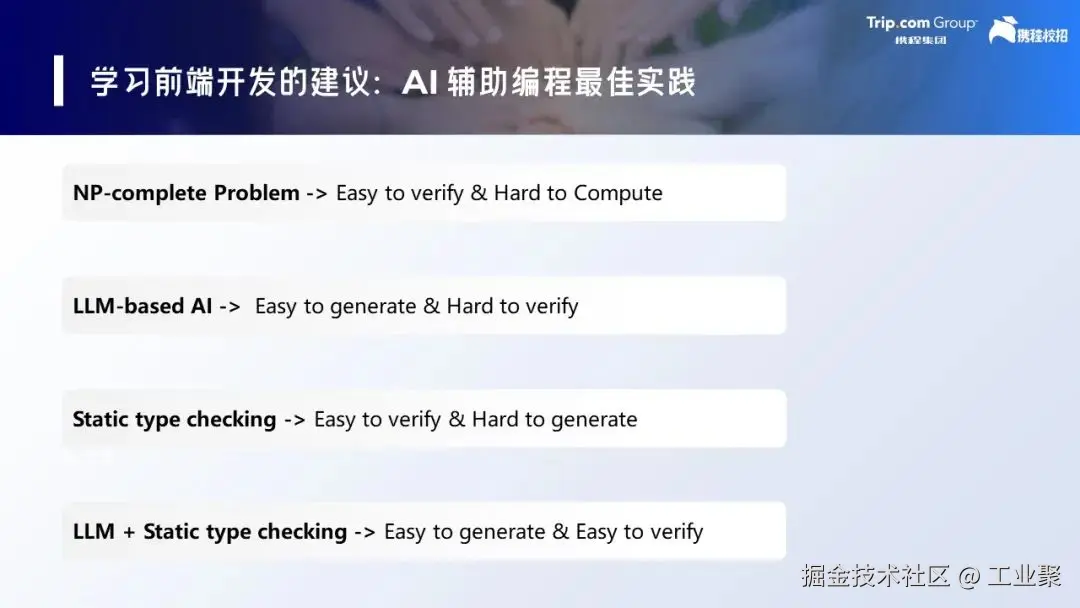 如上,我们通过挖掘 LLM-based AI 背后的基础理论要素——概率(Probability)和程序(Program),用它们的基本性质,更好地理解了 LLM 的行为特征(Easy to generate, Hard to verify),同时推导出了 AI 辅助编程的最佳实践(LLM + Static type checking),并且得到了相关论文和数学家使用案例的一些佐证。