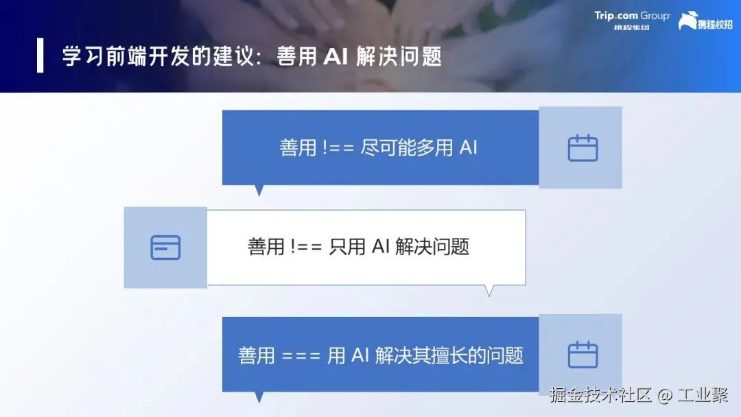 积极拥抱 AI,既不是减少在领域知识和专业基础的投入,也不是优先用 AI,更不是只用 AI。其实还是在原来的基础上,将 AI 能力用在刀刃上,用在解决之前无法解决或难以解决的问题上。
