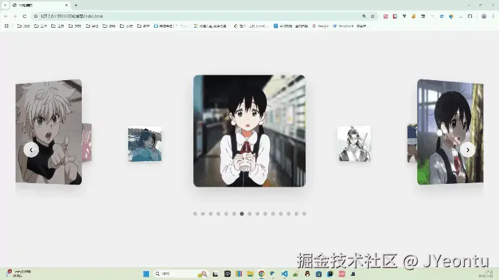 - transform-origin:设置旋转中心点在容器中心的正后方(Z 轴负方向),使图片围绕一个虚拟的圆心排列。