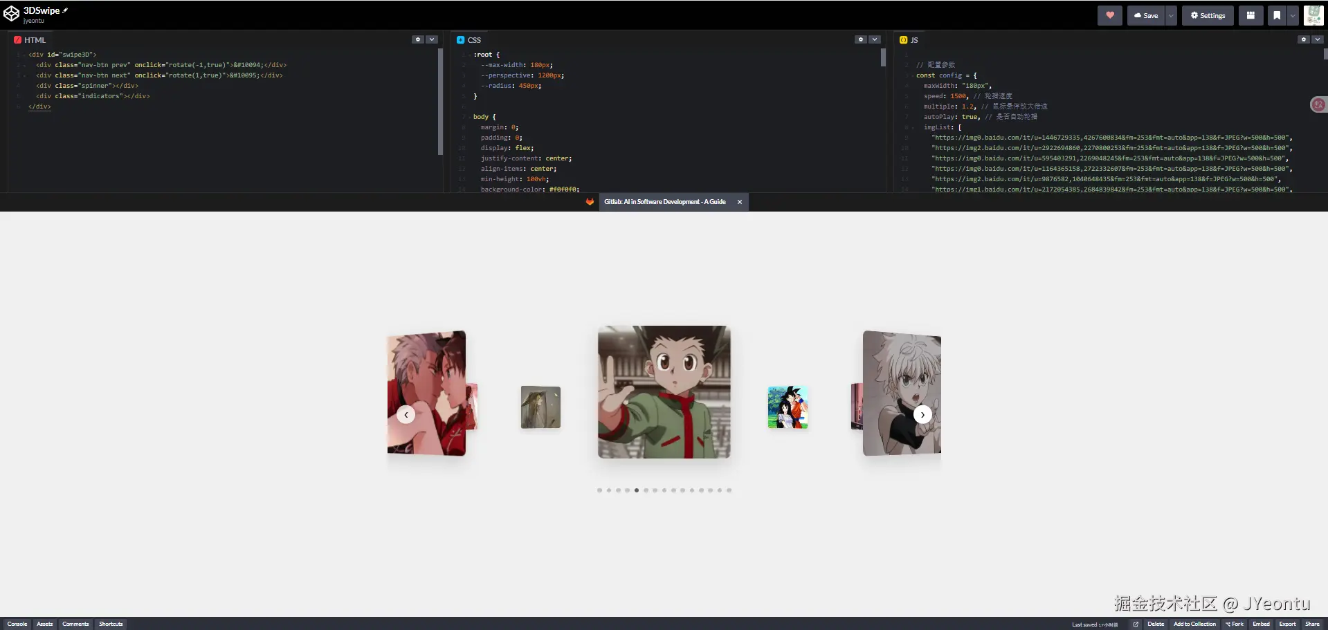 根据配置中的图片列表来动态创建图片元素,并设置好旋转角度,根据图片个数创建对于长度的指示器。