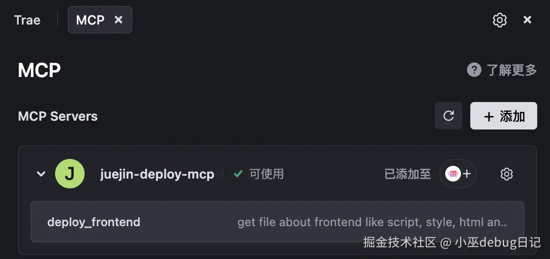 使用文档:通过 Trae 等 AI IDE 配置 MCP一键发布到掘金:juejin.cn/post/750646…