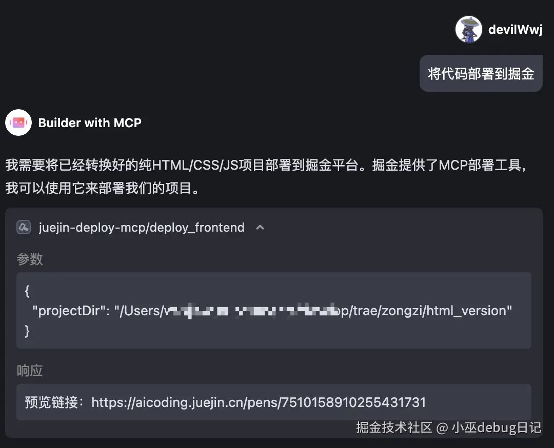 前面我们已经配置了一键部署应用到掘金的MCP Server,我们只需要在对话框中提示“将代码部署到掘金”,模型就会帮助我们将工程部署到掘金。