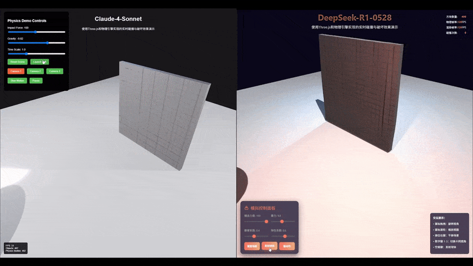 更令人信服的是,AI 科技博主「karminski-牙医」通过实际测试对比了 DeepSeek-R1-0528 和 Claude 4 Sonnet。结果显示,无论是对光线漫反射的理解,还是对物体运动轨迹的预测,亦或是用户界面的美观程度,DeepSeek-R1-0528 都展现出了明显的优势。