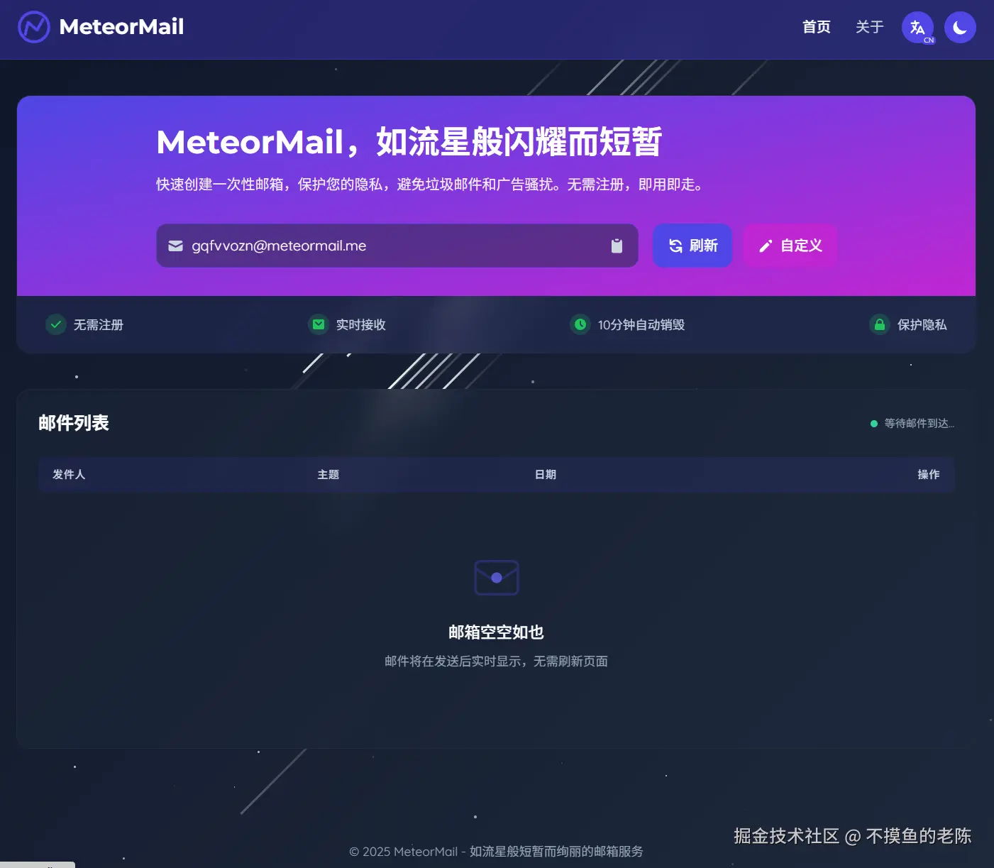 MeteorMail是一款基于Node.js的自托管临时邮箱,提供RESTful API,支持Docker一键部署,代码已开源。