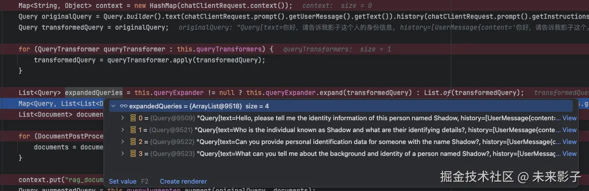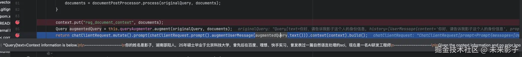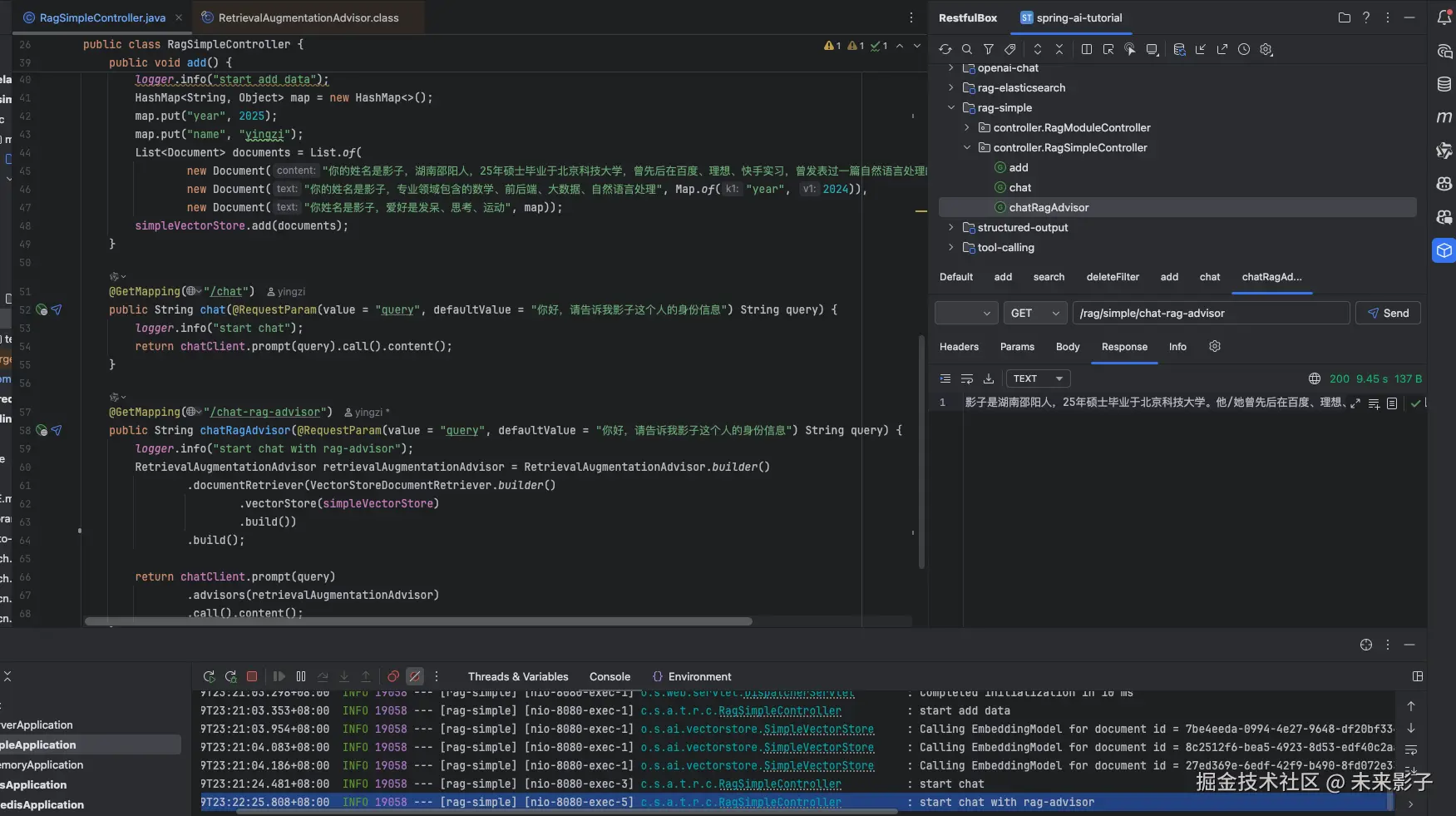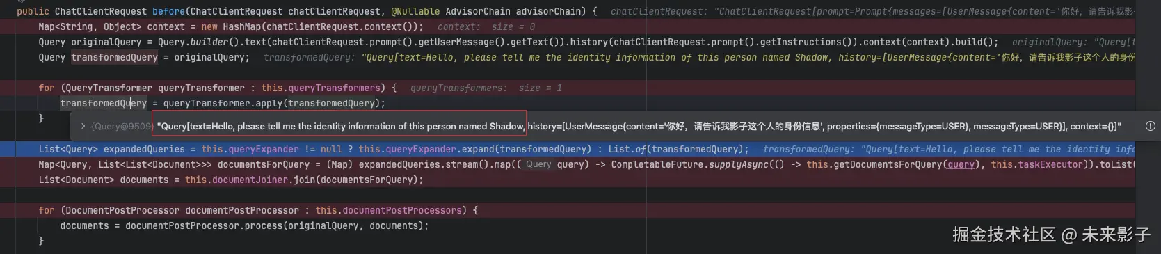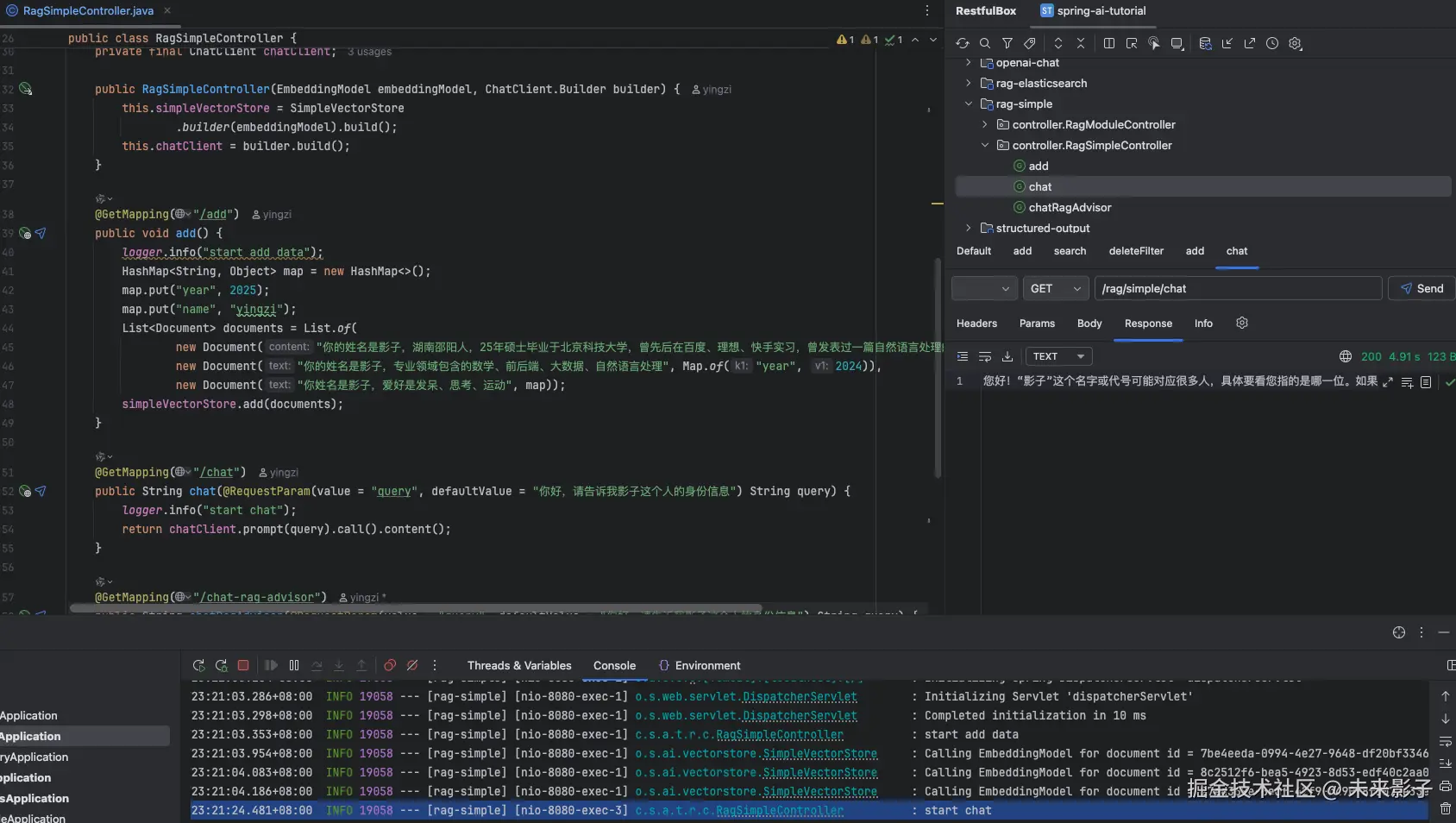 public String chatRagAdvisor(@RequestParam(value = "query", defaultValue = "你好,请告诉我影子这个人的身份信息") String query) {
