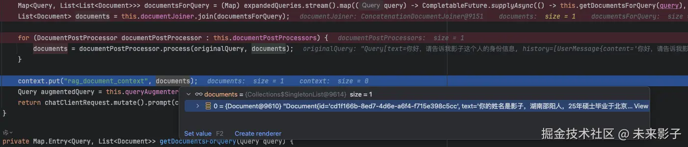 PromptTemplate promptTemplate:用户自定义提示模版,用于生成增强查询PromptTemplate emptyContextPromptTemplate:用户自定义为空时的上下文提示模版boolean allowEmptyContext:是否允许空上下文Function<List<Document>, String> documentFormatter:用户自定义的文档格式化函数