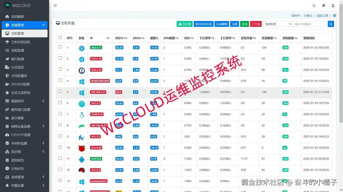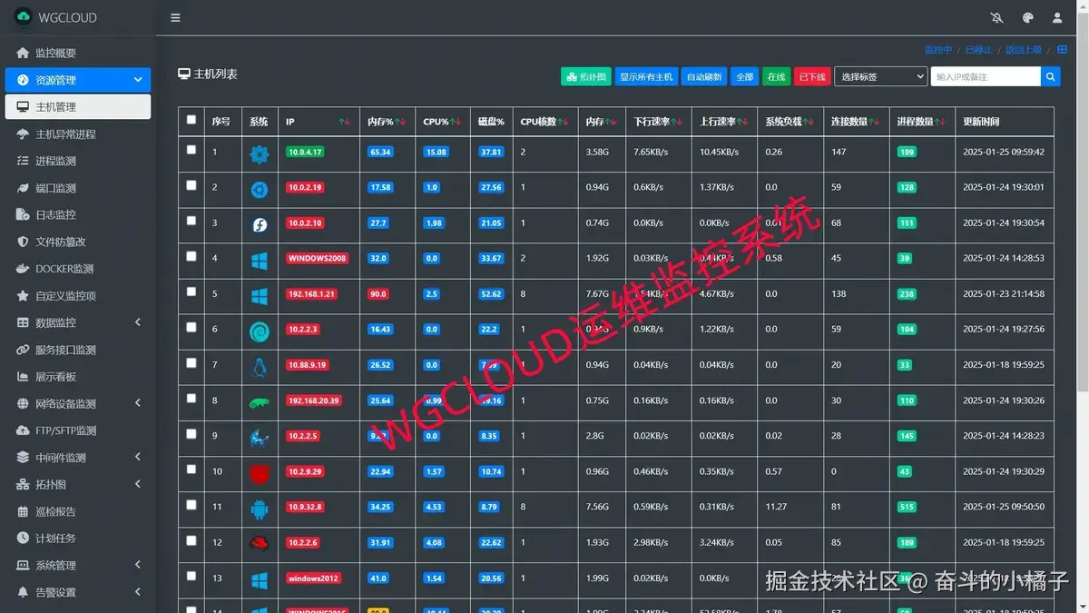 WGCLOUD主要用于管理主机或者服务器,监控收集服务器或主机的各种指标数据(cpu使用率,cpu温度,内存使用率,磁盘容量空间,磁盘IO,硬盘SMART状态,系统负载,连接数量,网卡流量,MAC地址,硬件系统信息,GPU,防火墙状态,CRONTAB等)。支持监测服务器或主机上的进程应用、文件防篡改、端口、日志文件、DOCKER容器、数据库、数据表等资源。支持监测服务接口API、网络设备(如交换机、路由器、打印机)PING和SNMP监测、自定义监控指令、计划任务等。自动生成网络拓扑图,大屏可视化,web SSH,巡检报告,指令下发批量执行,FTP/SFTP监测,K8S监测,Kafka监测,Redis监测,Nginx日志检测,资产管理,设备账号管理,工作笔记,故障告警信息推送(如邮件、钉钉、微信、短信等)