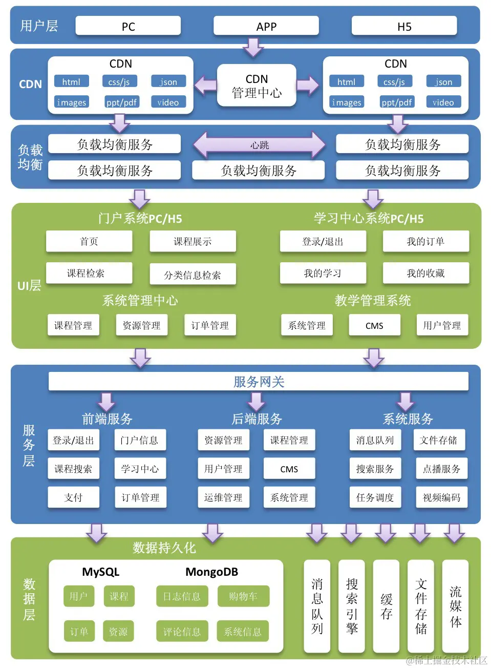 | UI层 | UI层描述了系统向pc用户、app用户、h5用户提供的产品界面。根据系统功能模块特点确定了UI层包括如下产品界面类型: 1)面向pc用户的门户系统、学习中心系统、教学管理系统、系统管理中心。 2)面向h5用户的门户系统、学习中心系统。 3)面向app用户的门户系统、学习中心系统未在上图标注,在app项目中有详细说明。 |