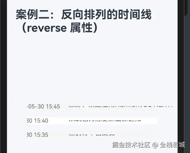 通过本教程的两个部分,我们详细讲解了如何使用Column组件的reverse属性构建反向排列的时间线,包括: