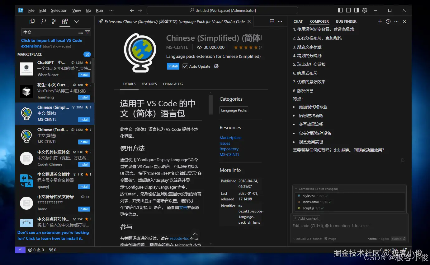 另外如果你不喜欢英文界面,可以安装汉化插件,直接在插件市场中搜索中文关键字,安装就可以了!