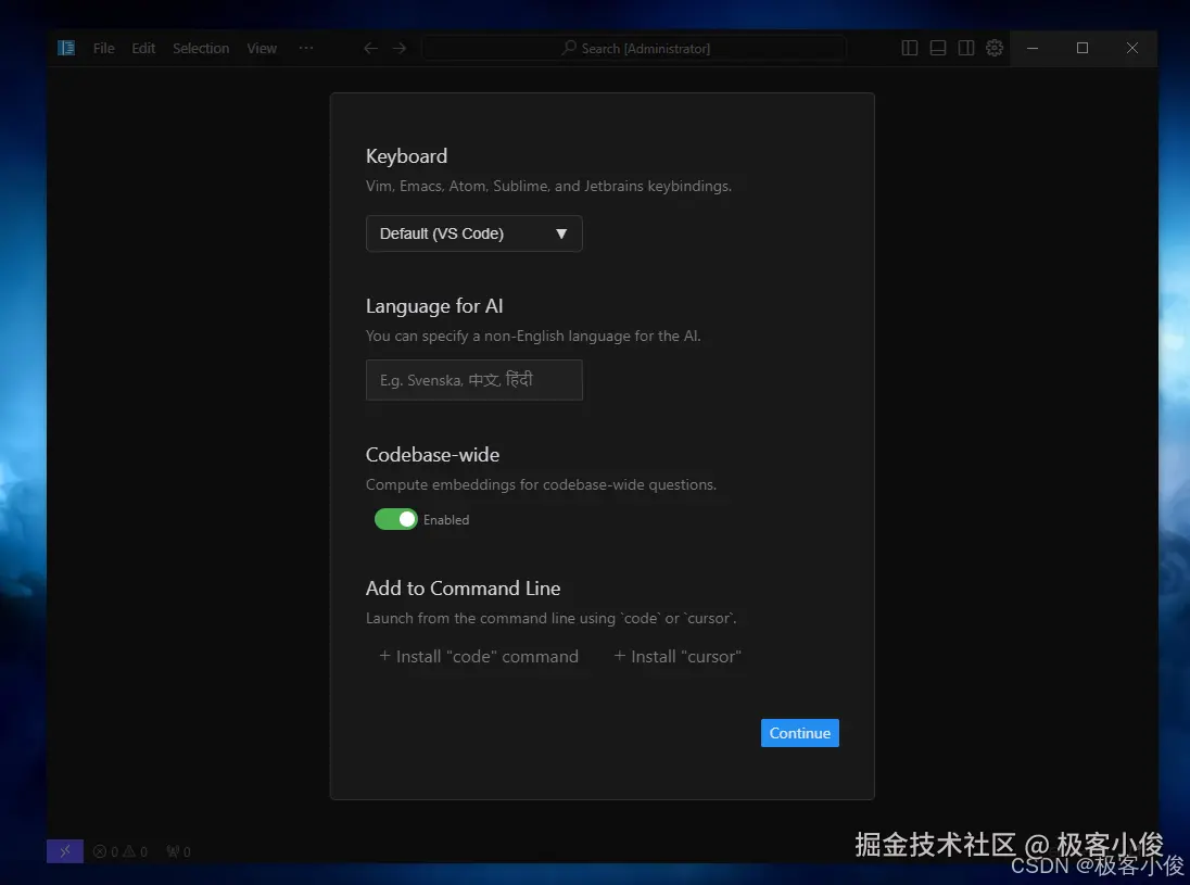 安装完成之后,会自动开启Cursor,然后进行一些初始化的配置!