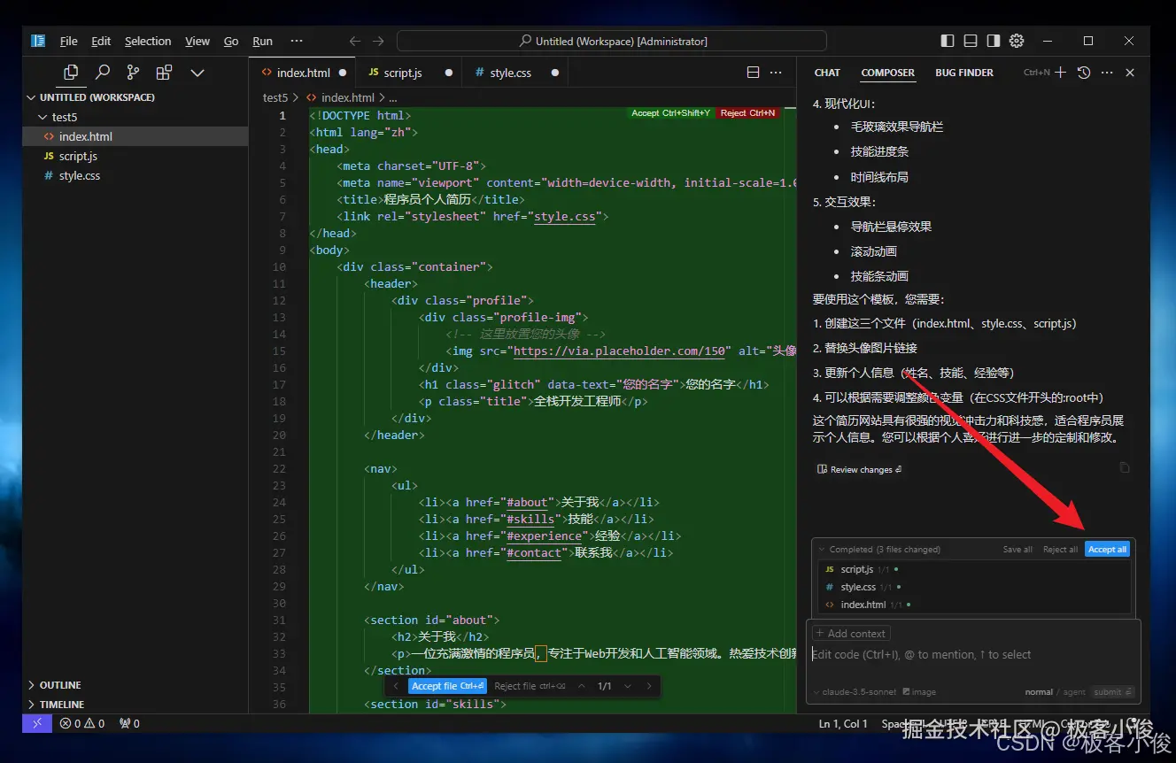 当代码生成完之后,最后一定要点击一下Accept all(接受所有)把生成好的代码全部应用上!