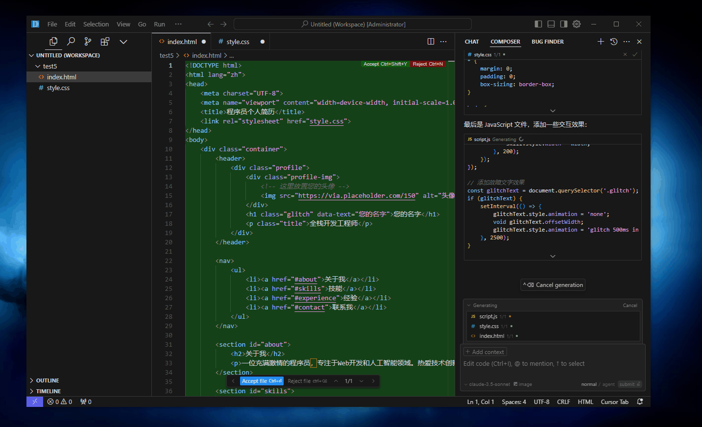 那这里我们是要使用html+css3+javascript给我们自动生成一个程序员的个人简历网站!