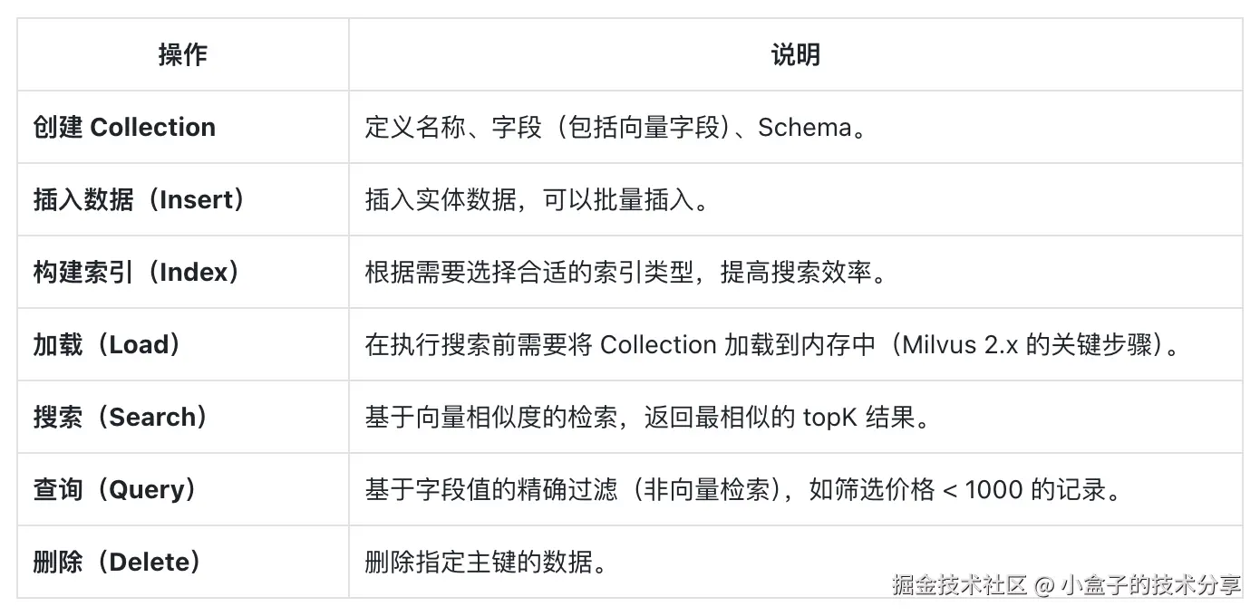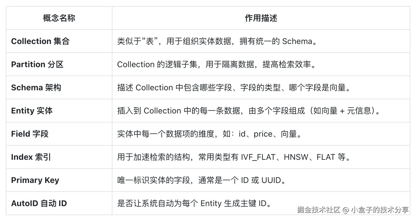 二、Milvus 核心概念速查表