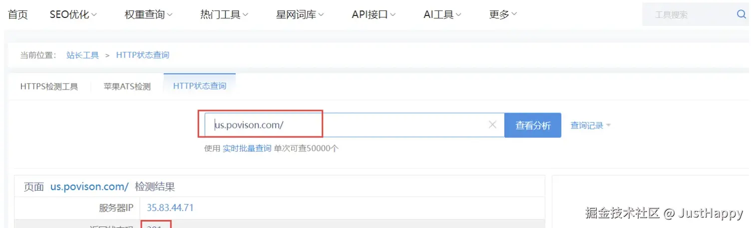 那么如何验证 301 重定向是否生效呢?可以使用站长工具 HTTP状态查询 查看返回的状态码是否为301:
