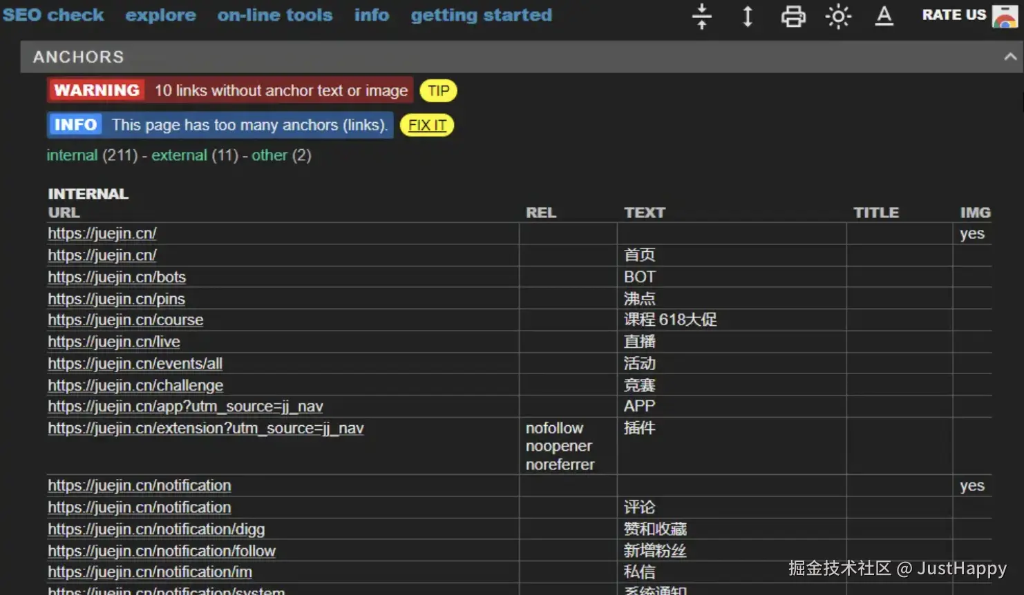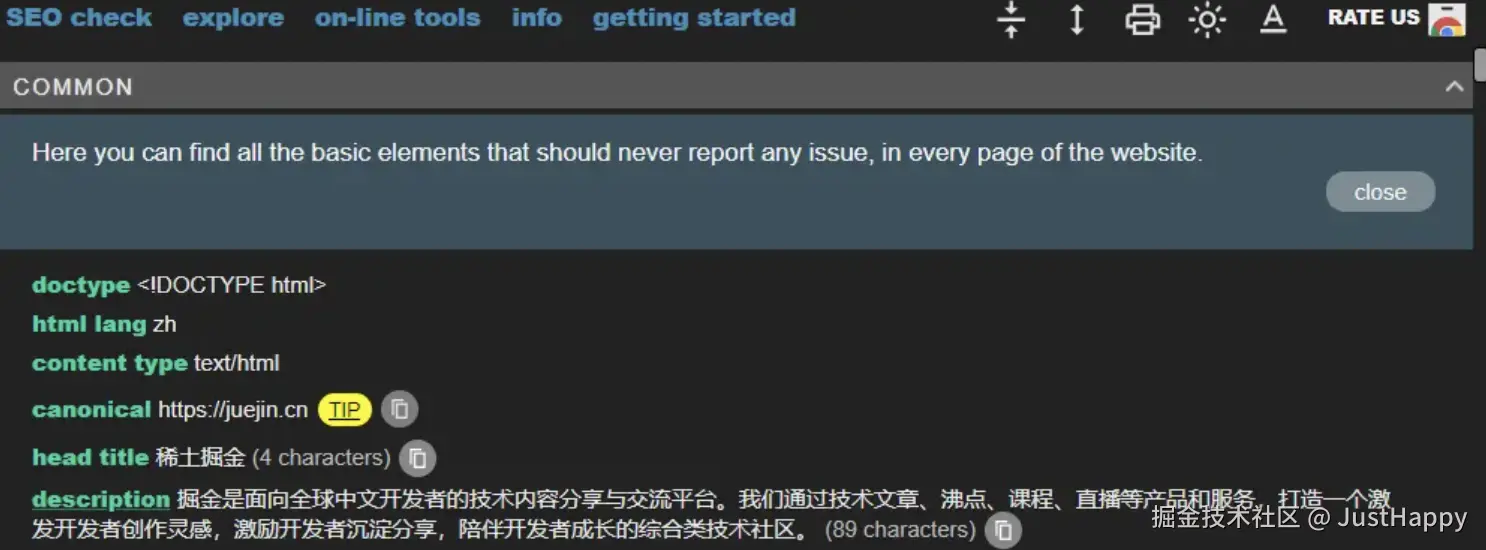 - 分析网页SEO信息:META SEO inspector,一个谷歌浏览器的扩展,使用它分析掘金网站的 SEO 信息: