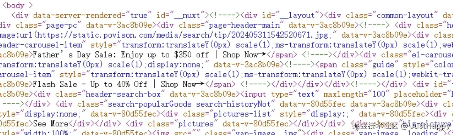 由于爬虫只能抓取到网页的静态源代码,而无法执行其中的 js 脚本,当网站采用 Vue 构建的单页面应用时,实际上是采用客户端渲染的方式,页面上的大部分 DOM 元素是在客户端通过 JavaScript 动态生成的。
