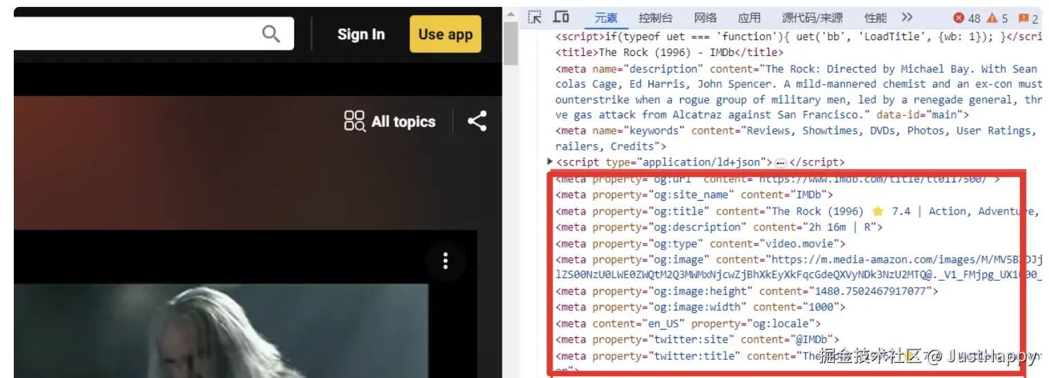 这个协议其实很简单,主要是通过在 html 中加入一些元数据(meta)标签来实现,property 属性以 og 开头,后面跟着具体属性,content 里面是属性的值,来看个案例: