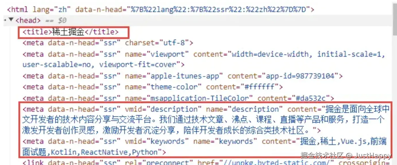 当然这三者的内容是有一定要求的,比如字符数长度的限制,想详细了解的小伙伴可以自行查阅,下面看下掘金网站的 TDK: