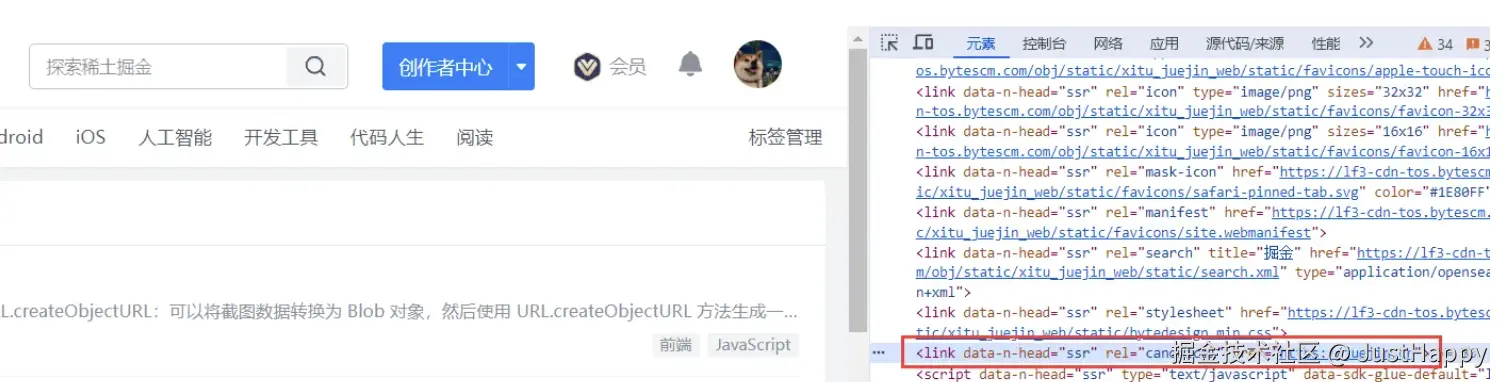 掘金网站设置的 canonical 属性: