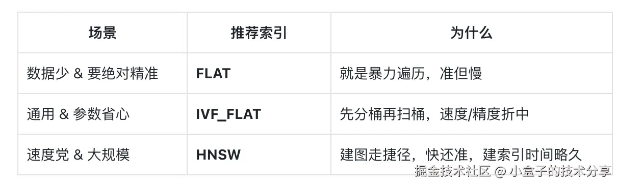 - 装电梯 create_index();小数据直接 FLAT,大数据先 IVF,再视情况换 HNSW。