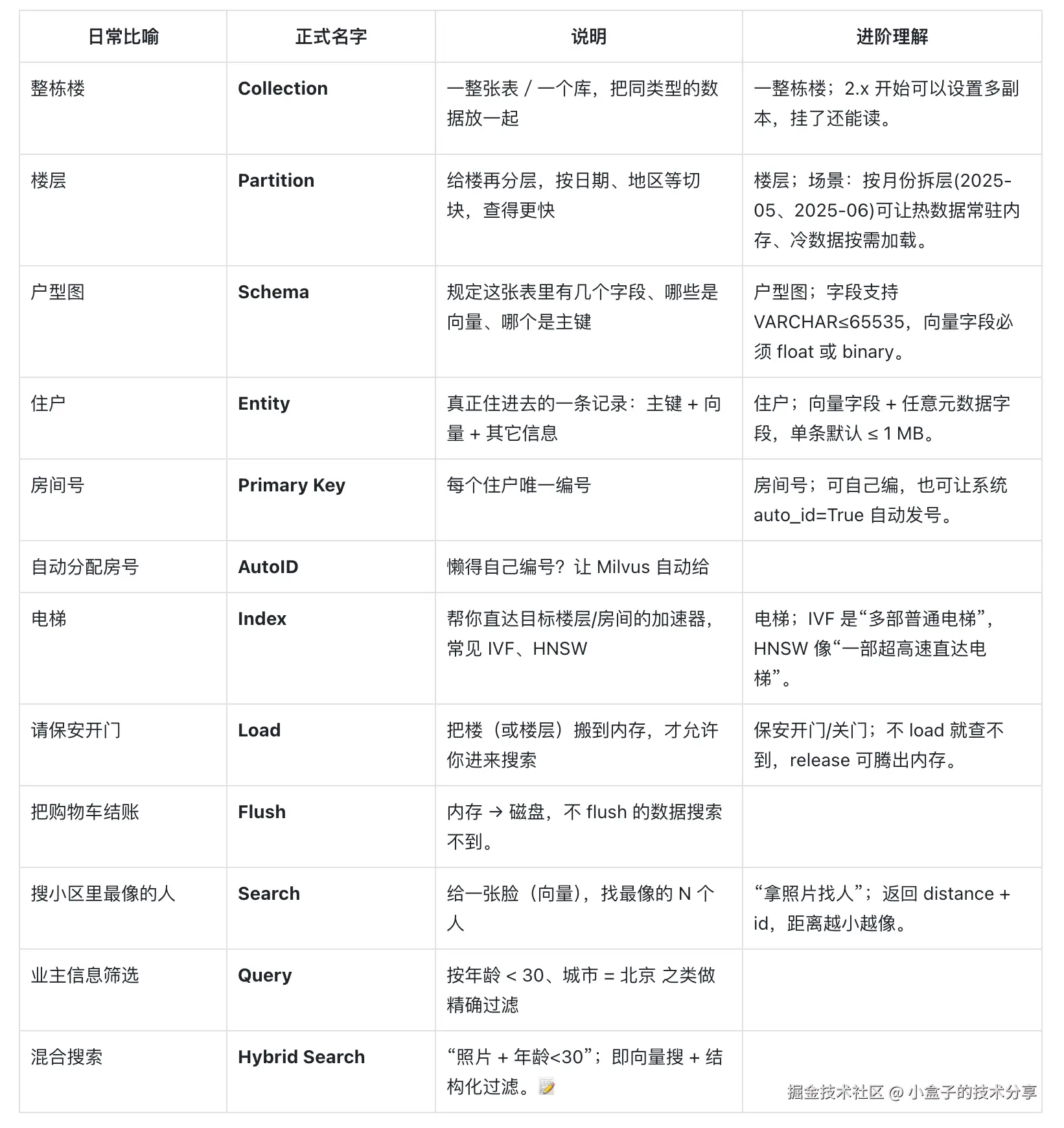- 和普通数据库比,Milvus天生会“模糊配对”,不是 exact match 而是“谁更像”。