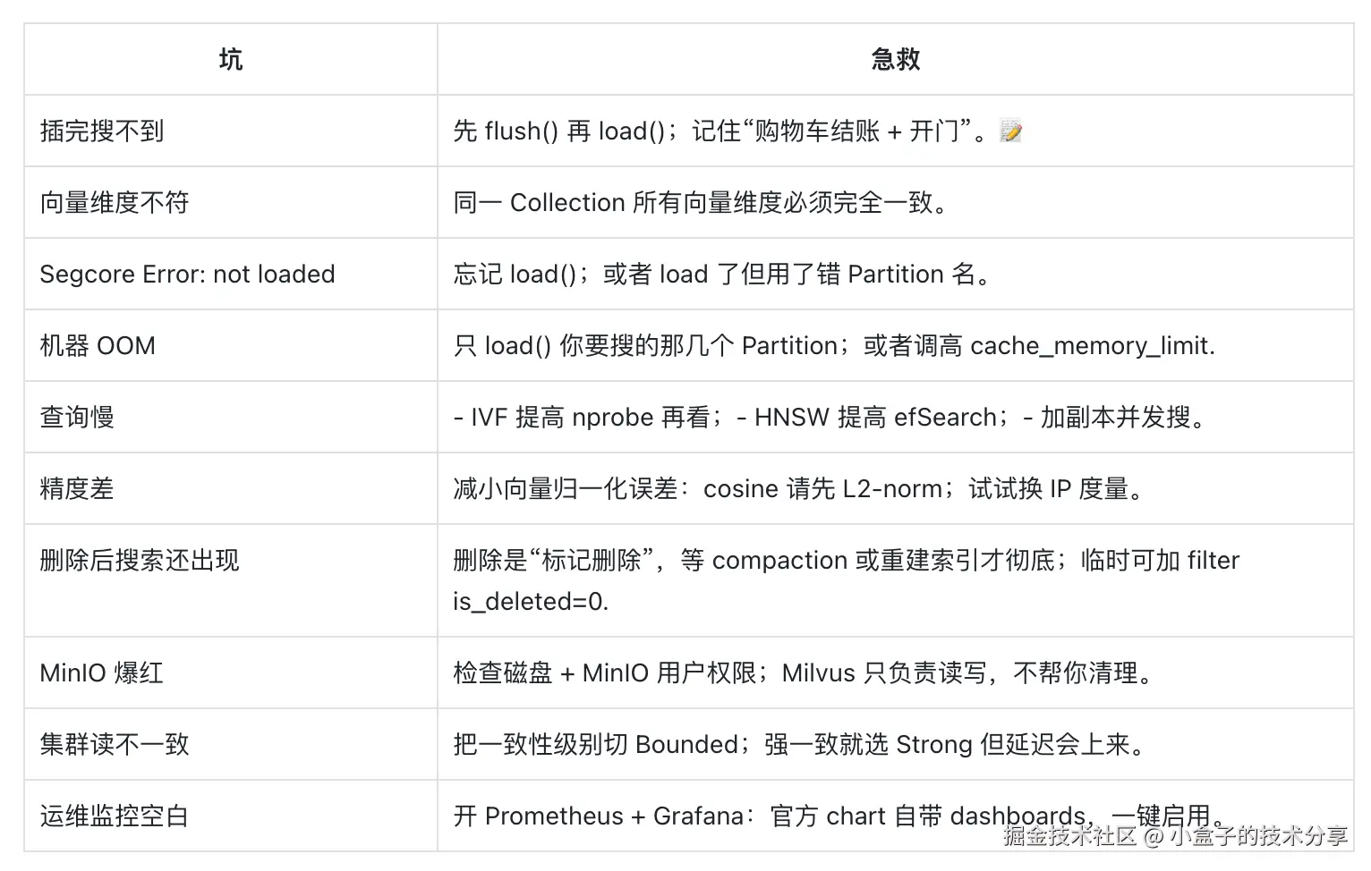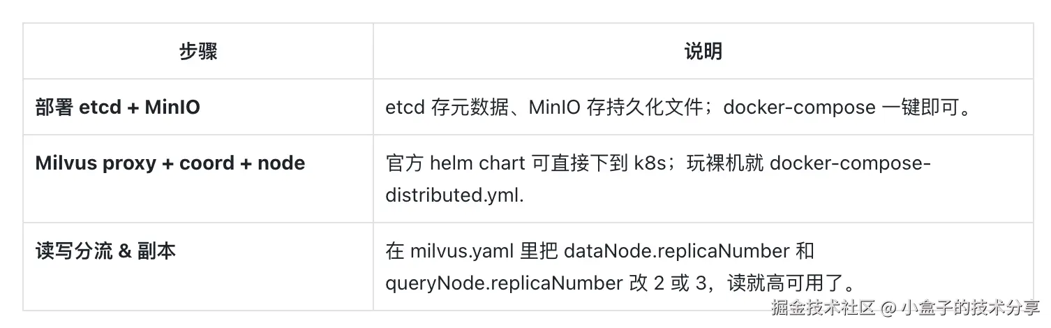- 持久化:Milvus 本身用 RocksDB + MinIO 存数据,你不用操心怎么落盘。