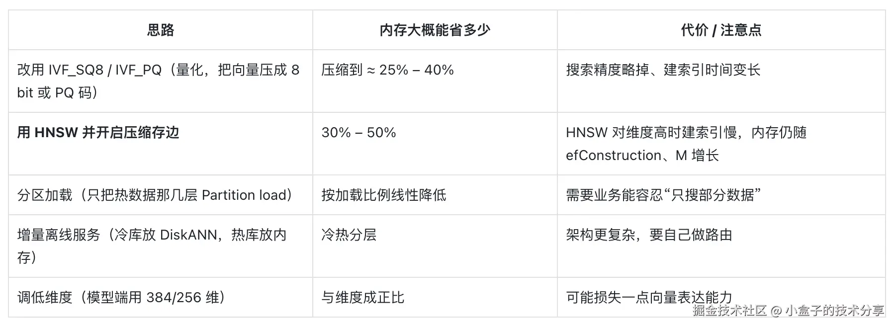 - 例:1 亿条 768 维 → 768×4×1e8×1.4 ≈ 430 GB(得至少 512 GB 机器,或分区加载)。