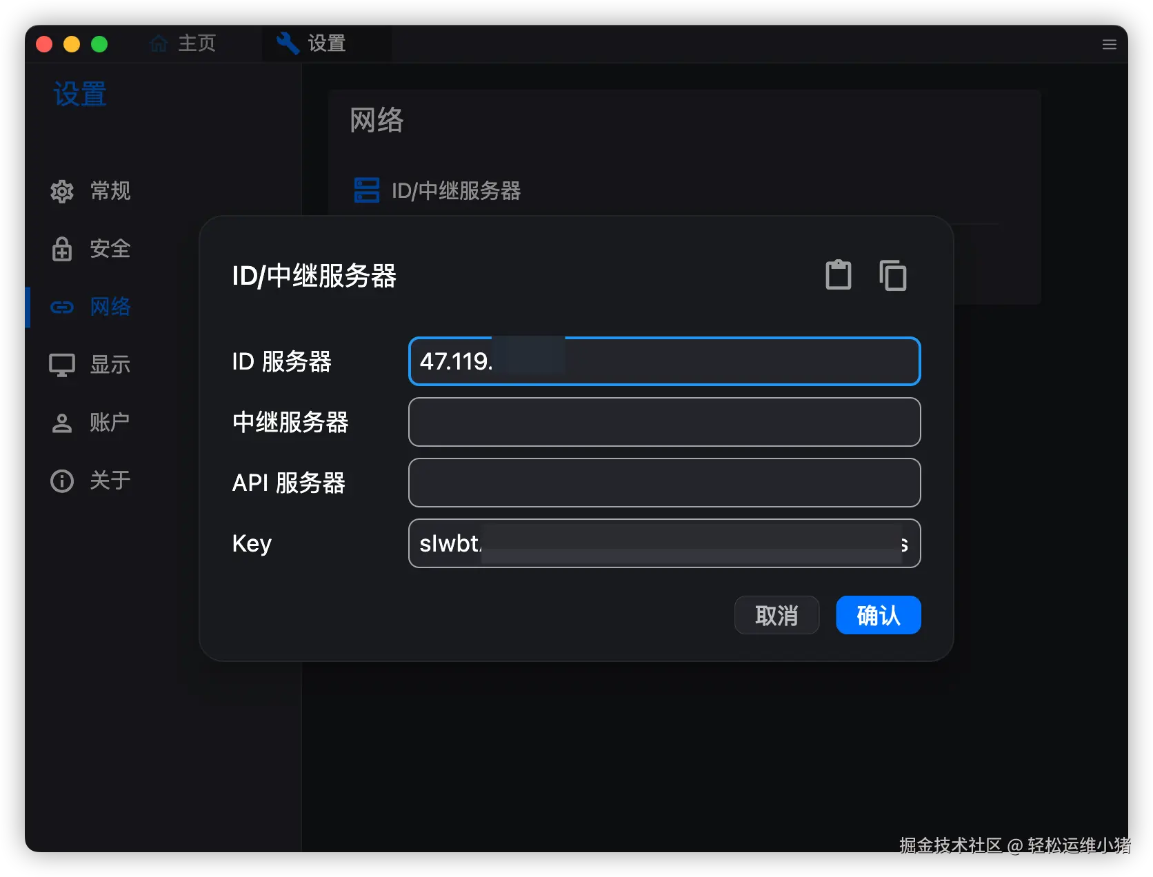 点击解锁网络设置,输入密码验证成功后,然后点击 ID/中继服务器。填写两项: