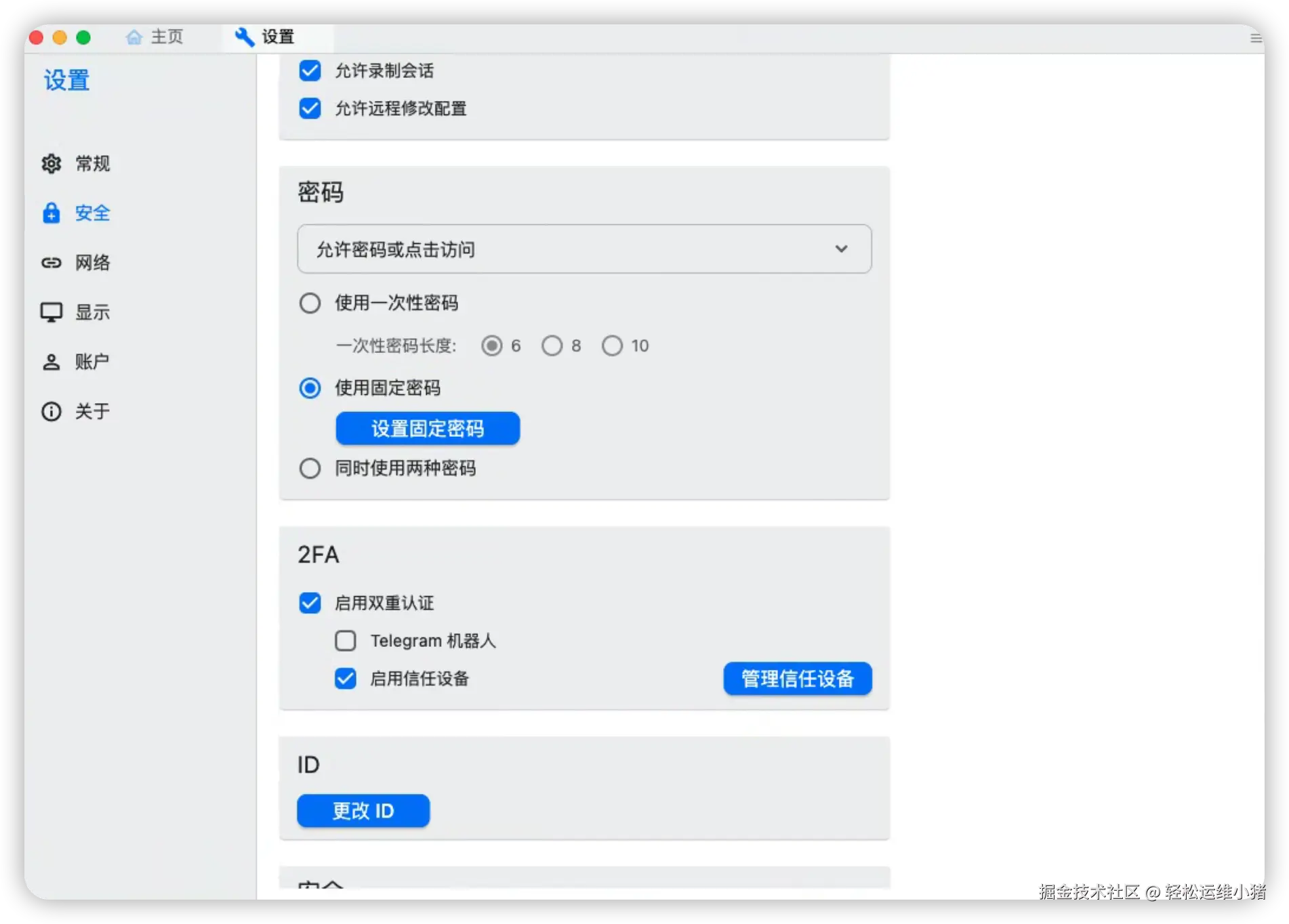 在主控端输入被控端的 ID 和一次性密码,也可以在被控端配置设置固定密码和 2FA。