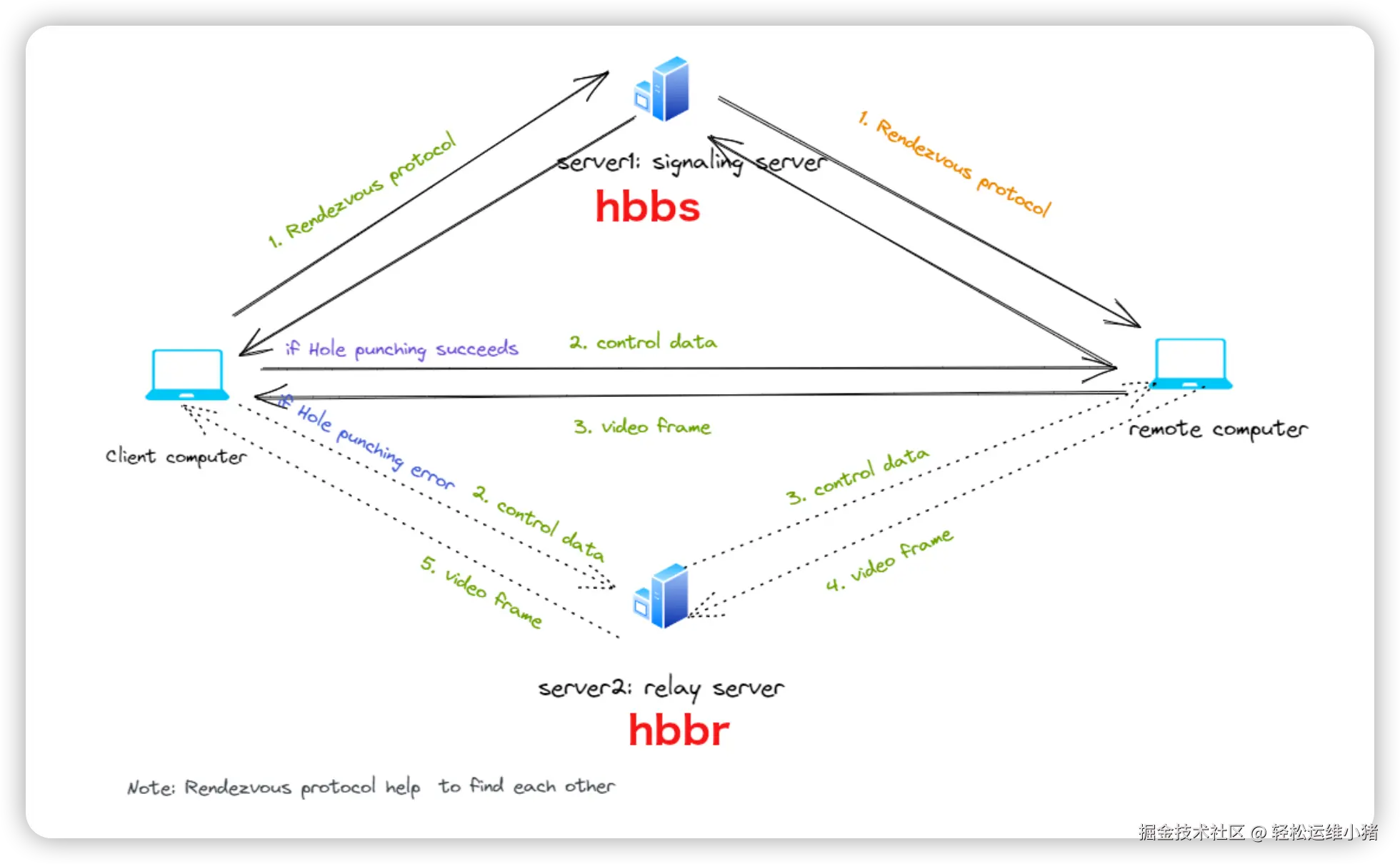 以下是 RustDesk 客户端如何与 hbbr / hbbs 通信流程图: github.com/rustdesk/ru…