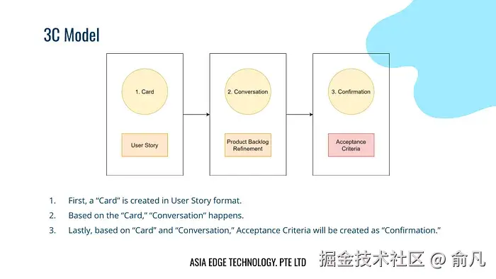 敏捷宣言最初签署人之一、极限编程(XP)创始人 Ron Jeffries 提出了 3C 模型,该模型概述了有效创建用户故事的三步过程。这三个步骤是卡片(Card)、对话(Conversation)和确认(Confirmation),每一步都是在前一步的基础上进行的。在第一步中,用户故事卡(User Story card)包含了最终用户想要使用产品的简要摘要。第二步是团队和利益相关者的对话,讨论用户故事细节。第三步是确认,向用户故事添加验收标准和可视化图像。理解这个基本流程对于编写高质量验收标准以及防止误解至关重要。