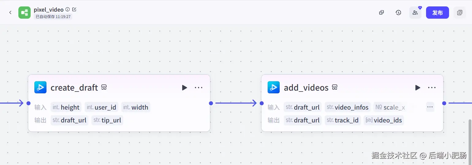 create_draft、add_videos(剪映小助手插件): 这两个节点承接视频生成线路,作用是生成空草稿,将前置节点生成的素材写入草稿。