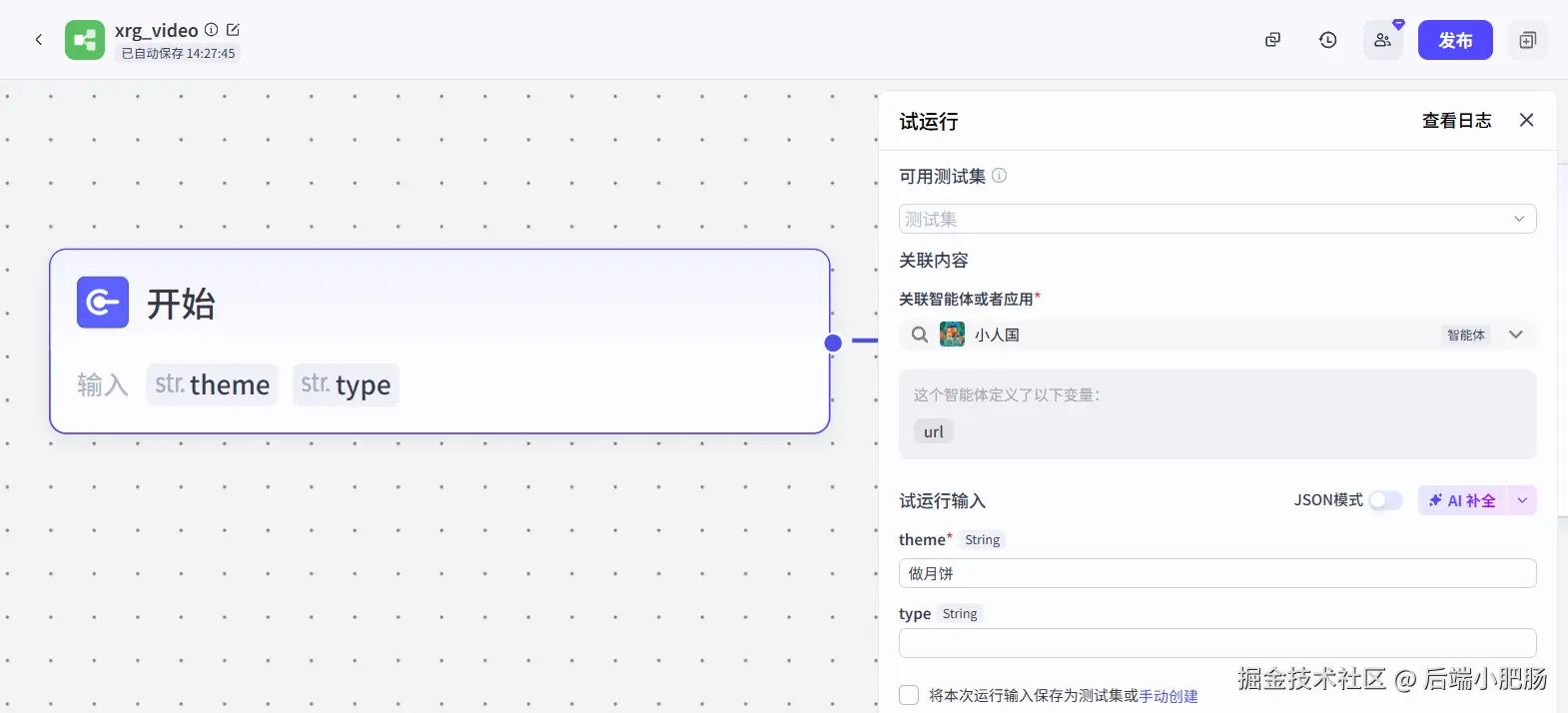 开始节点: 开始节点的输入参数需要指定图生视频插件(即梦或海螺)和主题,主题可以随便写,比如做月饼,摘桃子等,由于一键生成视频效果很差(试了一晚上把还即梦免费点数耗光了,心态也炸了...),我这边让它生成素材就好了。