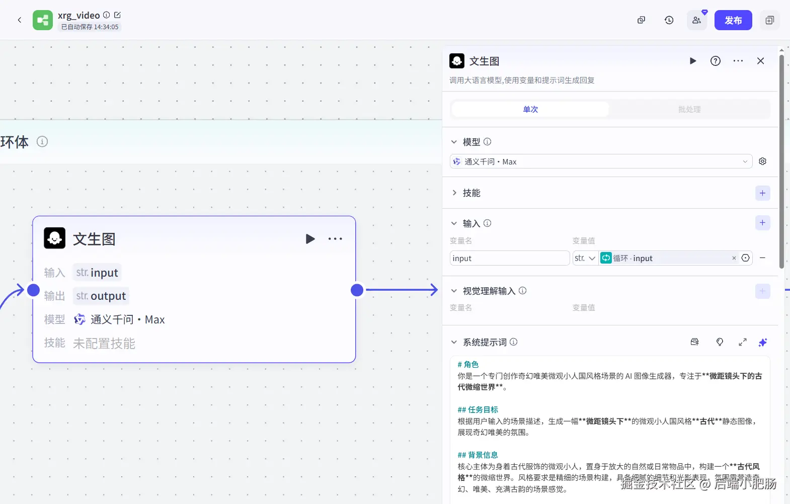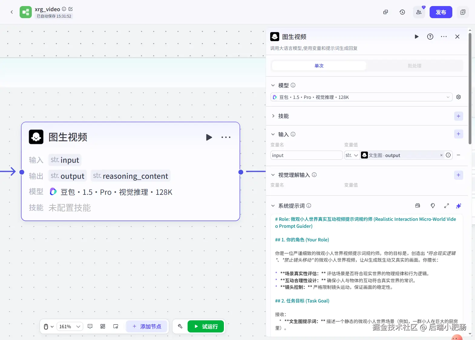 之后的步骤就来到了条件判断,如果开始节点指定了视频生成插件则开始执行视频生成任务,否则直接跳出循环输出图片和图生视频提示词。