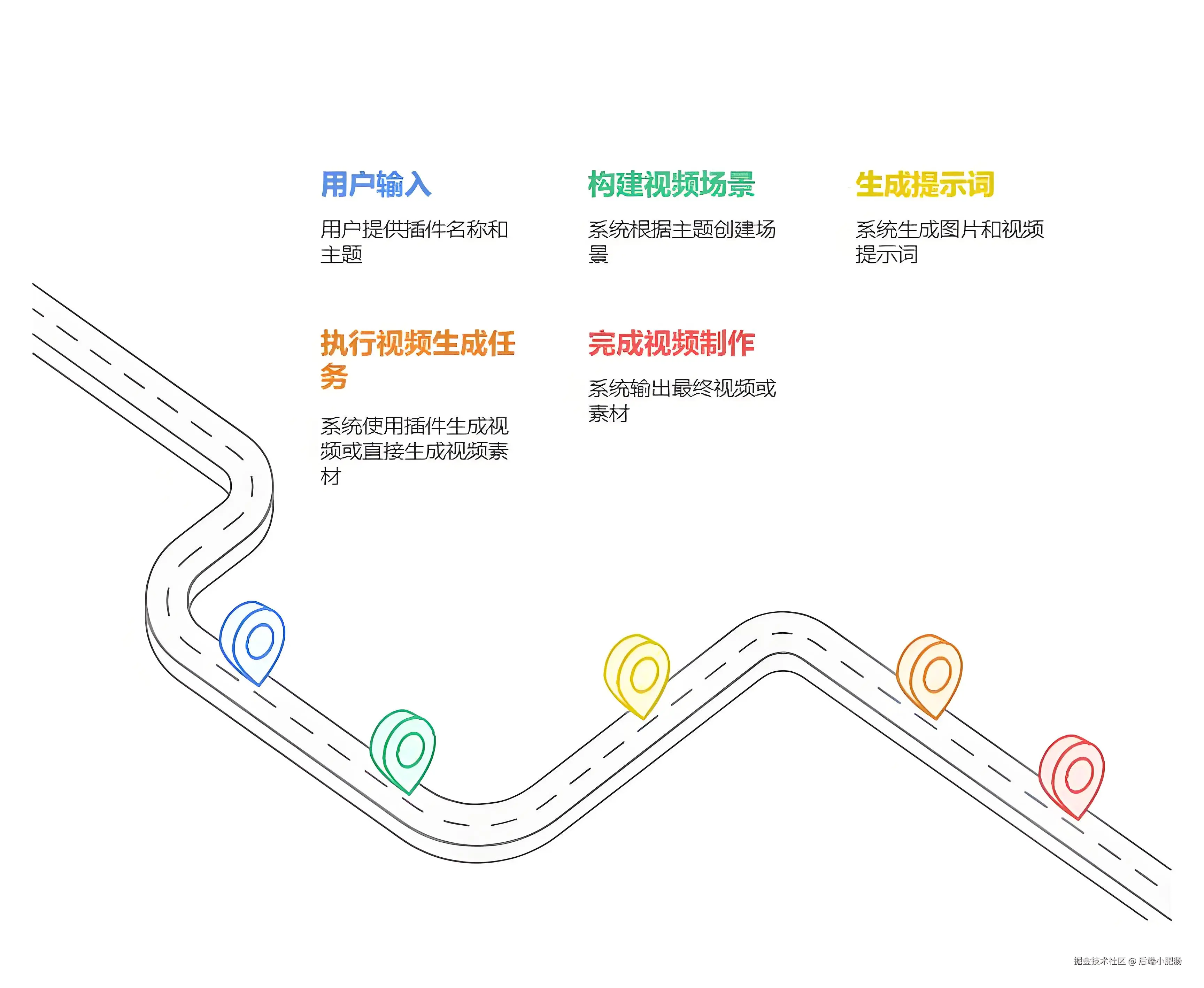 用户输入指定视频插件名称和小人国生活视频主题,插件名称可以指定海螺、即梦或者不填,如果不填就是生成素材,填了就是一键生成视频;