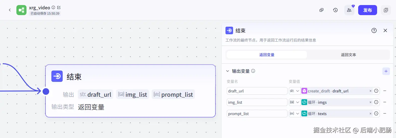 结束节点: 这个节点接收工作流的输出参数,如工作流路线为一键生成视频则输出剪映小助手草稿地址,否则为图片和图生视频提示词。