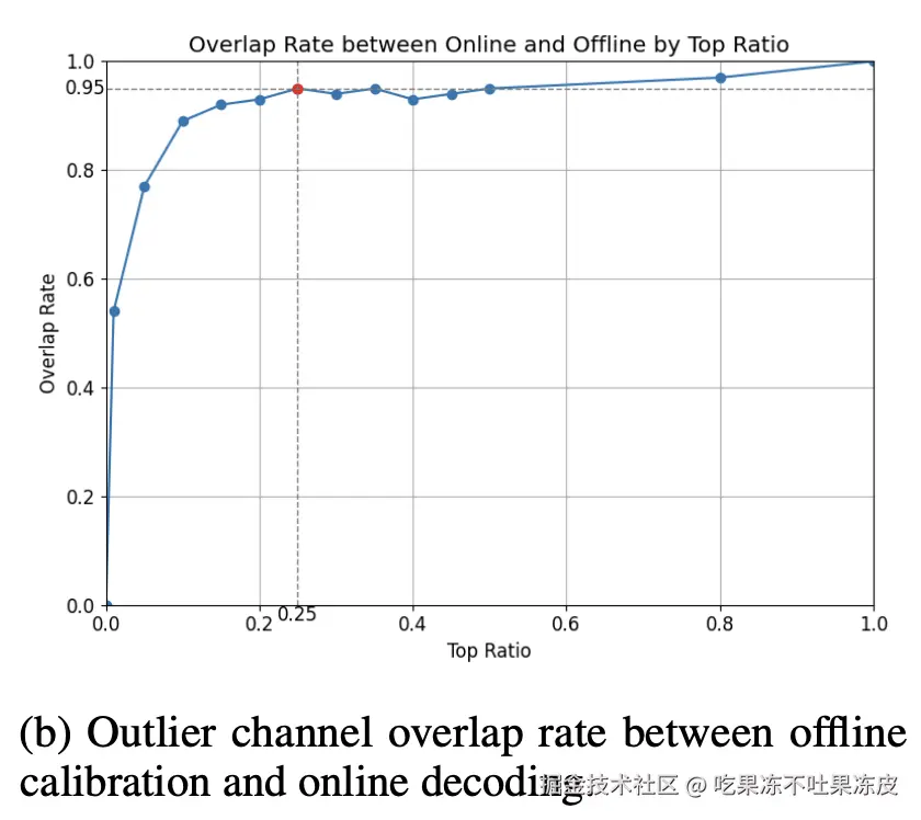 作者进行消融实验发现,当重要 Channel 的占比达到 0.25 时,通过离线方式确定的 Outlier Channel 与通过在线推理方式获得的 Outlier Channel 的重合度达到了 0.95。