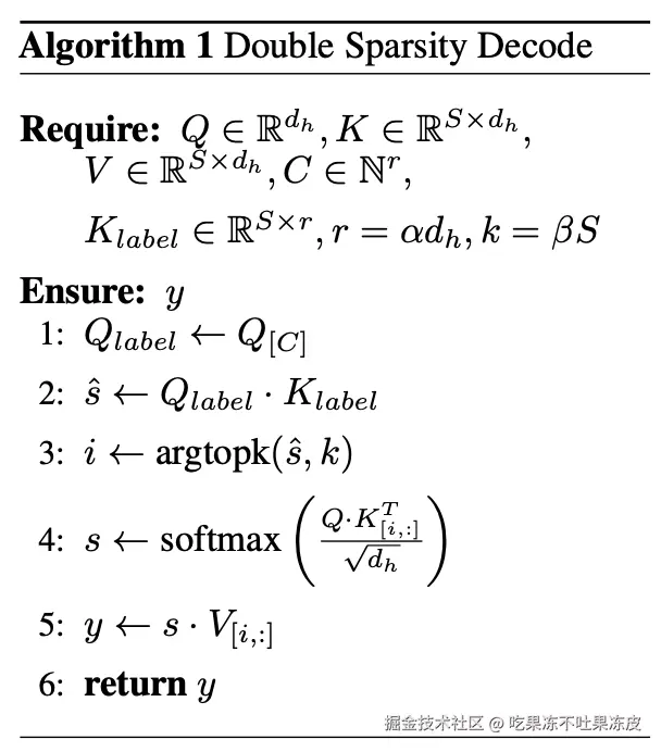 Double Sparsity 的解码过程及伪代码如下所示,整个计算过程分为以下几步: