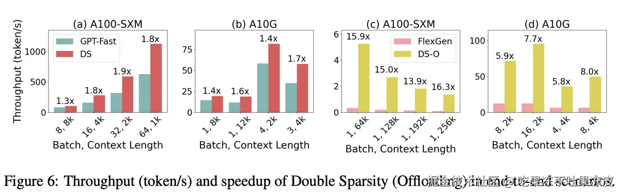 下图(a)(b)展示了 Double Sparsity 和 gpt-fast 在各个批量和序列长度下的吞吐量比较,单位是每秒处理的token数量。通过部署了Llama-2-7B模型,并尽可能最大化内存使用,以达到高负载条件。结果显示,Double Sparsity 在所有测试条件下都能带来至少1.3倍的速度提升。在某些情况下,速度提升甚至接近两倍,这展示了双稀疏的整体效率。