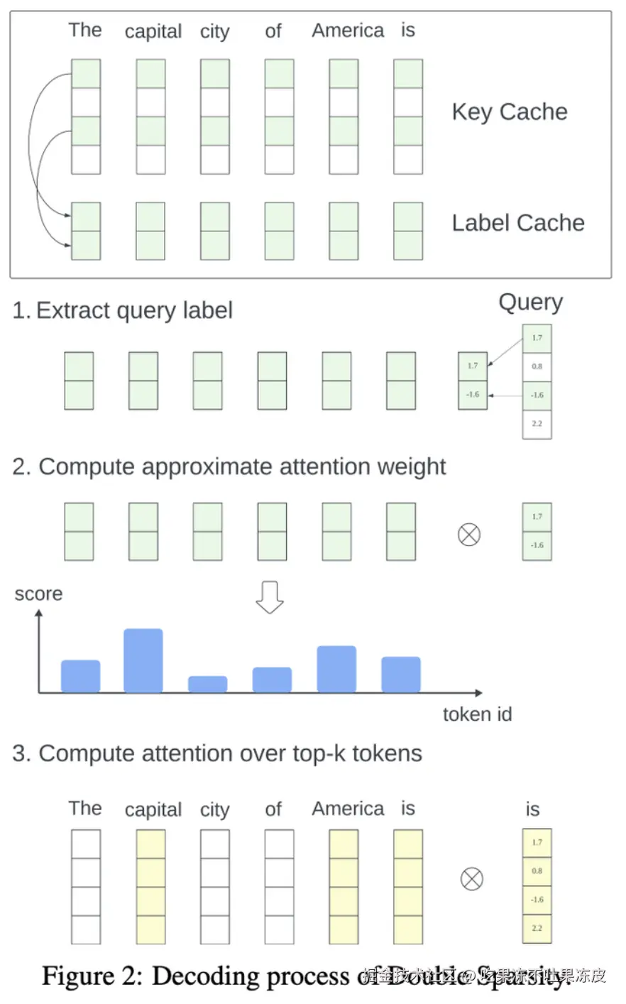 本文介绍了一种新型的训练后稀疏注意力技术 Double Sparsity。其结合了token稀疏和通道稀疏的方法,token稀疏专注于仅使用重要token进行自注意力计算,而通道稀疏则通过使用重要特征通道来识别重要token。受AWQ的启发,Double Sparsity 采用离线校准来预先确定对注意力分数影响最大的通道。同时为了避免不连续内存访问导致的性能下降问题,需使用 Label Cache 存储筛选后的重要 Channel。这里除了存储全量的 Key Cache,还要存储 Label Cache(新增的部分),因此,也增加了显存占用。