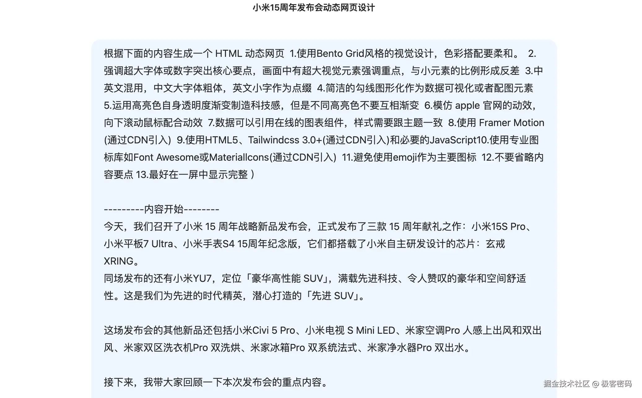 将雷军公众号当日万字长文作为输入素材