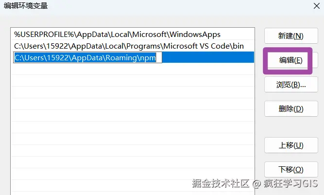 选中其中已经存在的C:\User\你的用户名\AppDate\Roaming\npm路径,并选择“编辑”,如下图所示。