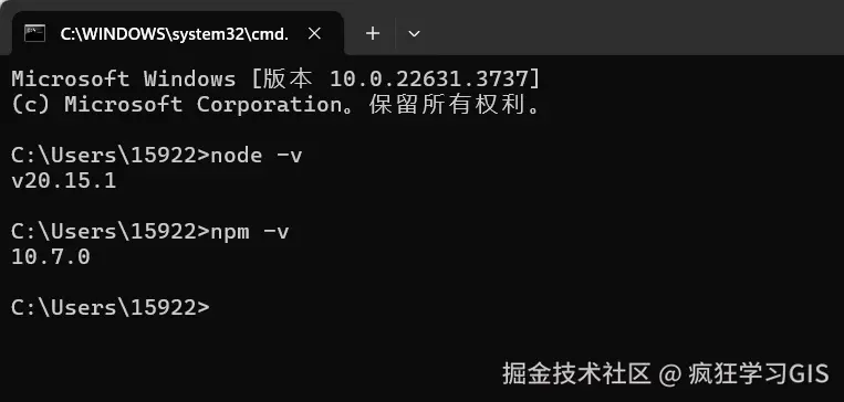 其中,前者用以显示Node.js的版本,后者则用以显示npm的版本。如果上述安装操作无误的话,执行代码后应得到如下图所示的结果。
