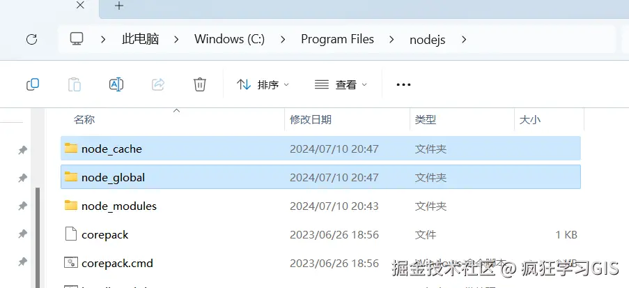 随后,进入前述我们所选择的Node.js的安装路径,并新建2个文件夹,分别命名为node_cache与node_global,如下图所示;这两个文件夹分别为npm的缓存文件夹与全局文件夹。当然,这里2个文件夹的名称也不一定非要按照这个来——只要在后续操作中,将对应文件名称修改为你设置的这2个文件夹的名称即可。