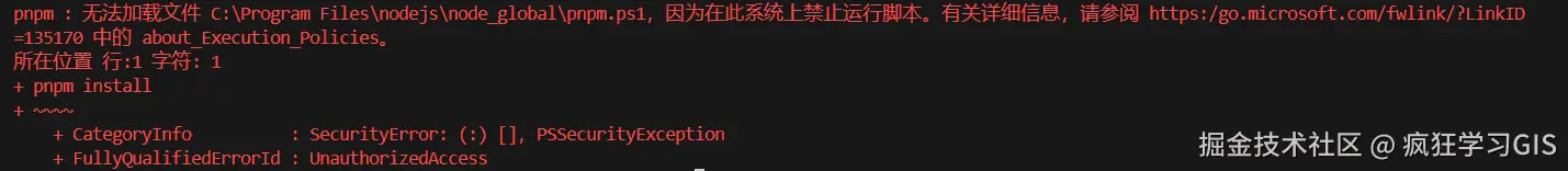 此外,还需要注意:在后续使用npm或者pnpm执行各类命令时,有可能会出现类似无法加载文件XXX,因为在此系统上禁止运行脚本。这样的提示信息,如下图所示。