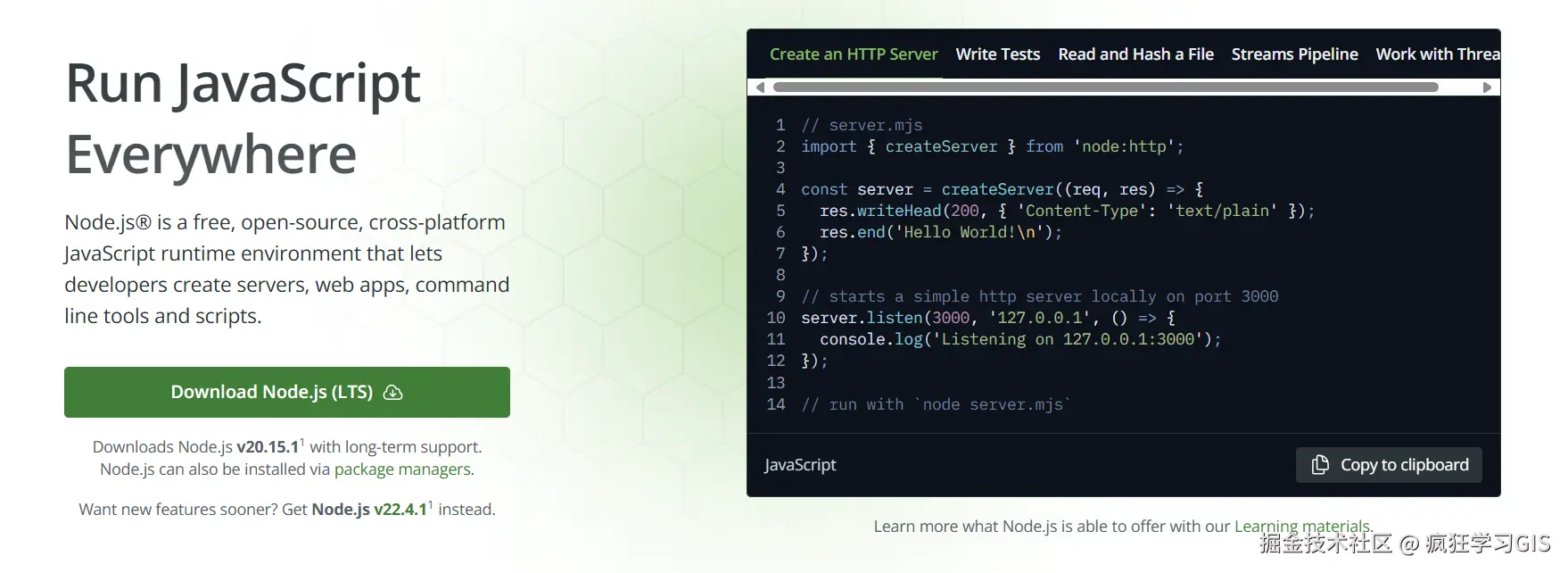 首先,我们进入Node.js的官方下载网站,并选择其中的Download Node.js (LTS) 按钮,如下图所示。点击之后,其会自动按照当前电脑的系统,为我们下载新版本、稳定的Node.js。