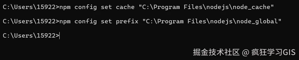 接下来,以管理员身份打开命令行,并分别输入如下的代码,用来告诉npm我们前面设置的缓存文件夹和全局文件夹到底是哪2个。其中,记得按照大家实际的node_cache与node_global文件夹路径,来对下面的代码加以修改。