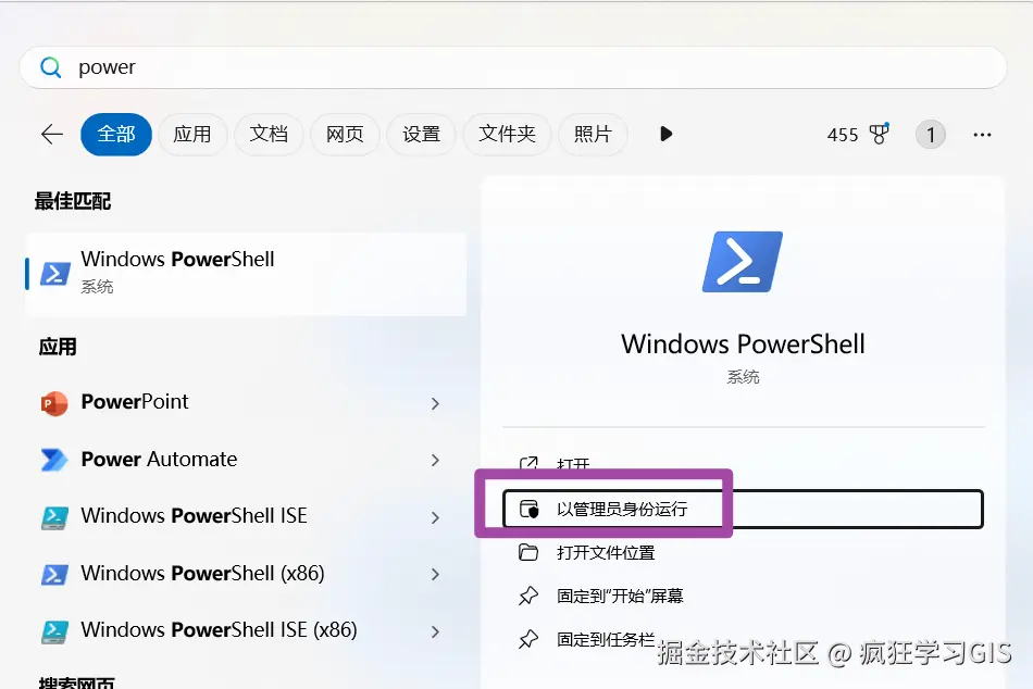 对于这种情况,我们首先用管理员身份打开Windows PowerShell,如下图所示。