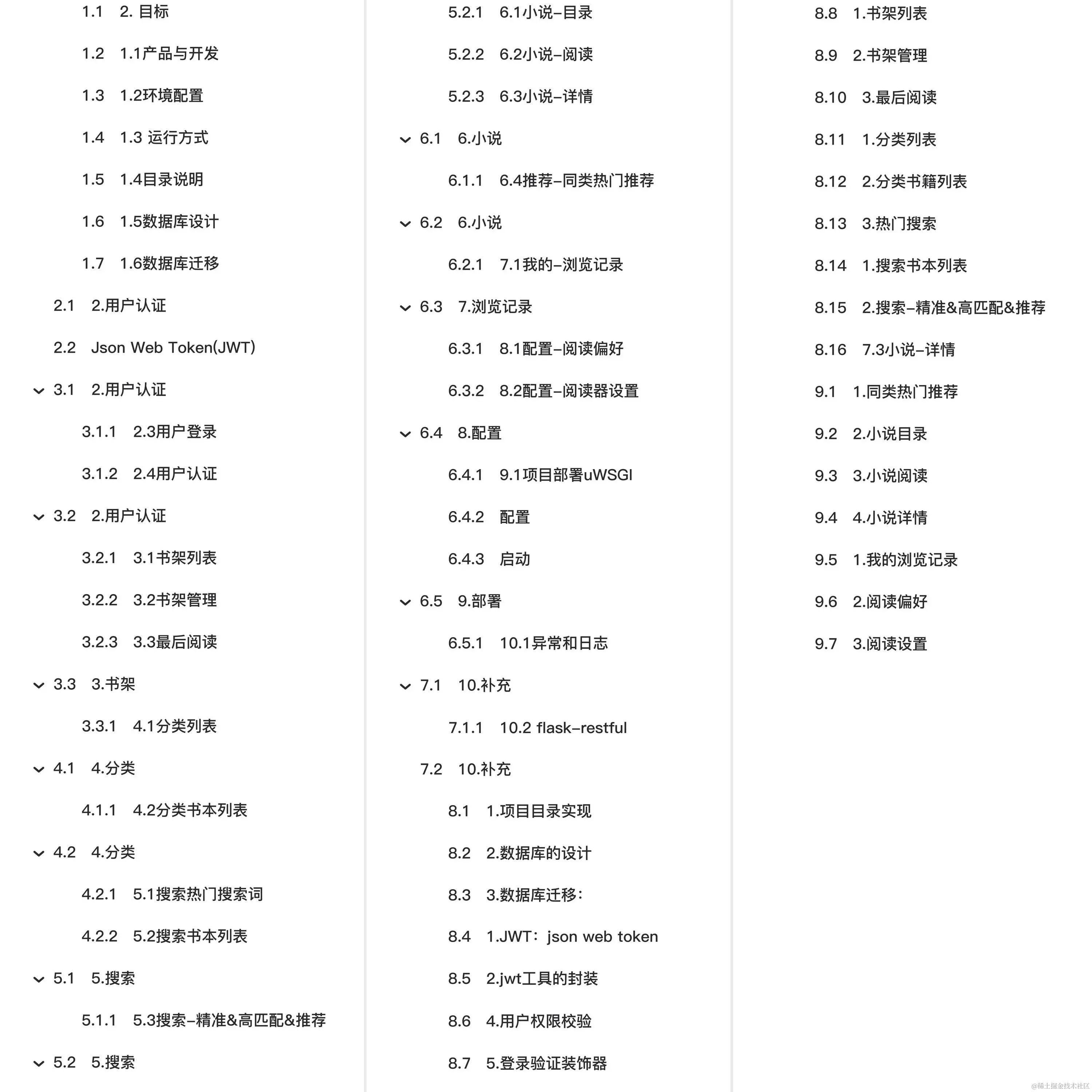 教程总体简介:2. 目标 1.1产品与开发 1.2环境配置 1.3 运行方式 1.4目录说明 1.5数据库设计 2.用户认证 Json Web Token(JWT) 3.书架 4.1分类列表 5.搜索 5.3搜索-精准&高匹配&推荐 6.小说 6.4推荐-同类热门推荐 7.浏览记录 8.1配置-阅读偏好 8.配置 9.1项目部署uWSGI 配置 启动 9.部署 10.1异常和日志 10.补充 10.2 flask-restful 1.项目目录实现 3.数据库迁移: 1.JWT:json web token 2.jwt工具的封装 4.用户权限校验 5.登录验证装饰器 1.书架列表 2.书架管理 3.最后阅读 2.分类书籍列表 3.热门搜索 7.3小说-详情 2.小说目录 2.阅读偏好 3.阅读设置